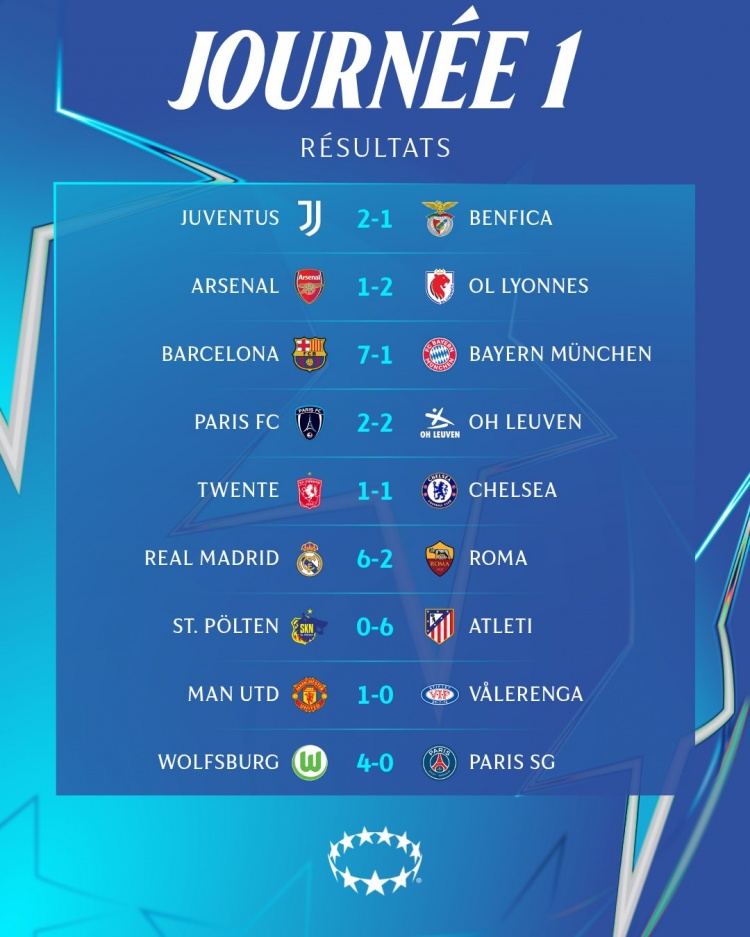 Sau vòng đầu tiên của UEFA Champions League nữ, Barcelona 7-1 Bayern, Arsenal 1-2 Lyon, Real Madrid 6-2 Roma, Juventus và Manchester United đều giành chiến thắng.